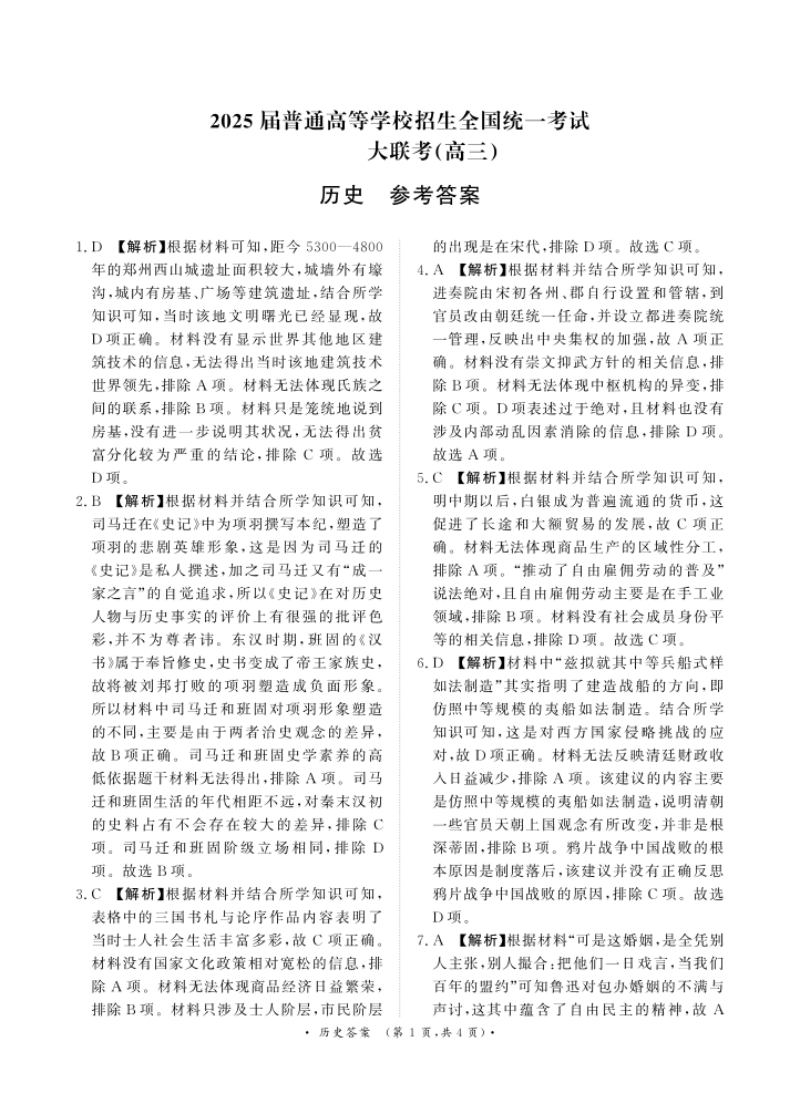 河南省部分重点高中2025届高三年级11月大联考历史答案