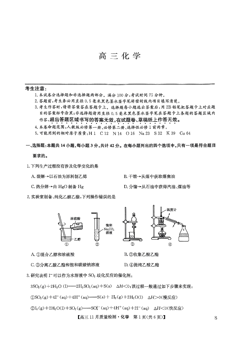 河南省区域高中2025届高三年级11月质量检测(九师联盟)化学