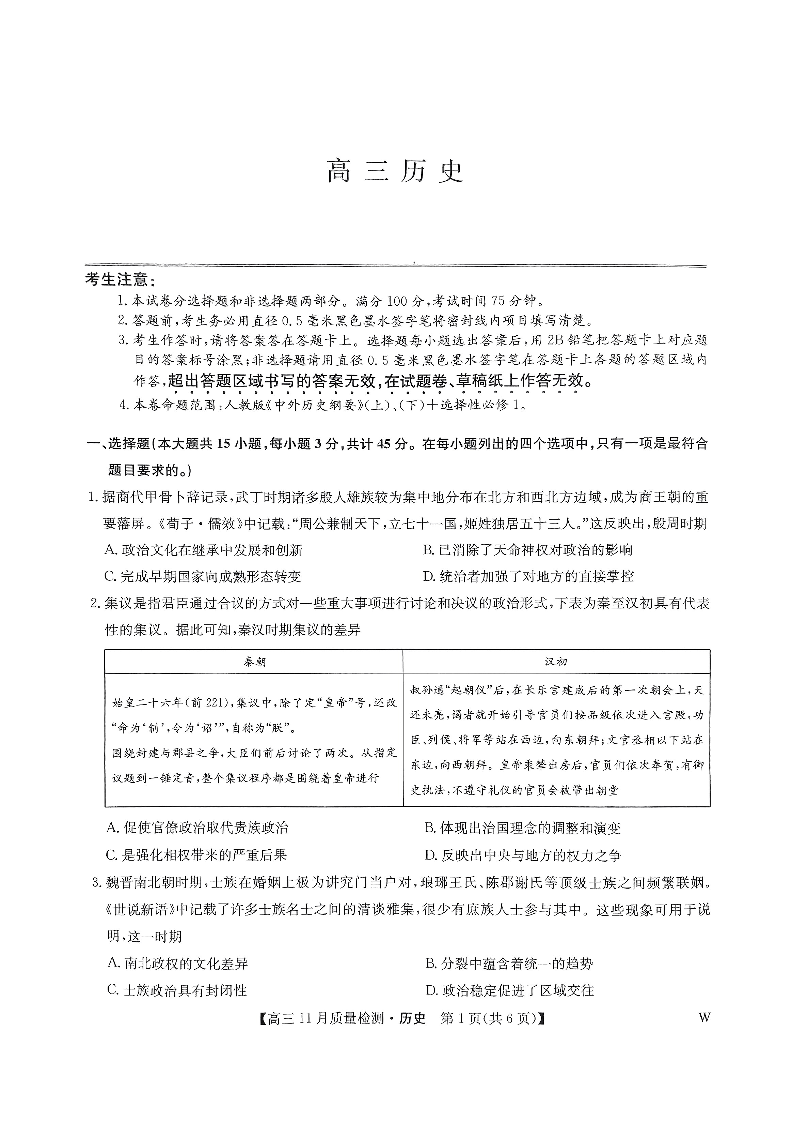 河南省区域高中2025届高三年级11月质量检测(九师联盟)历史