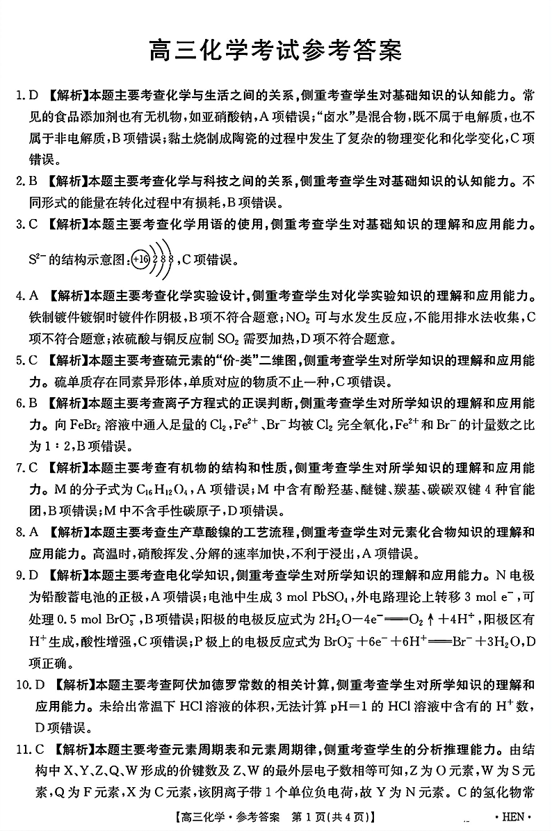 河南省驻马店市2024.11高三年级上学期期中考试化学答案