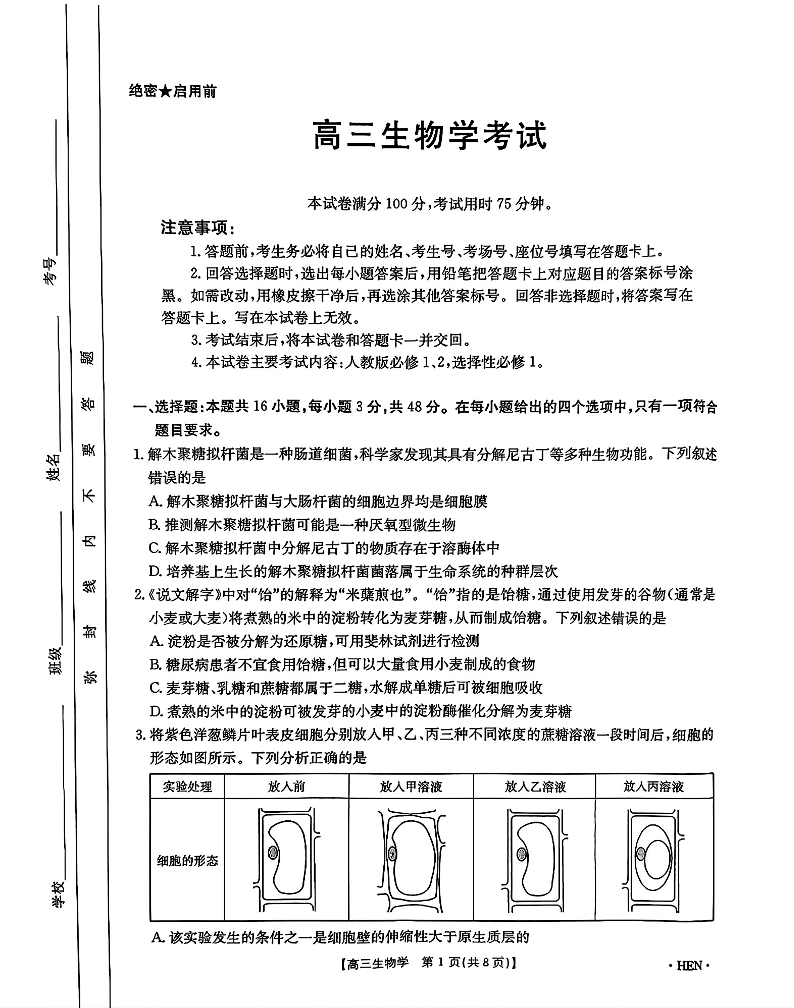 河南省驻马店市2024.11高三年级上学期期中考试生物+答案