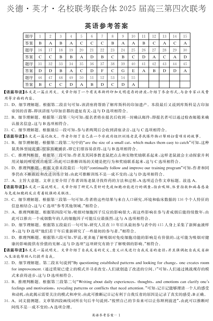 湖南省炎德英才名校联考联合体2025届高三第四次联考英语答案