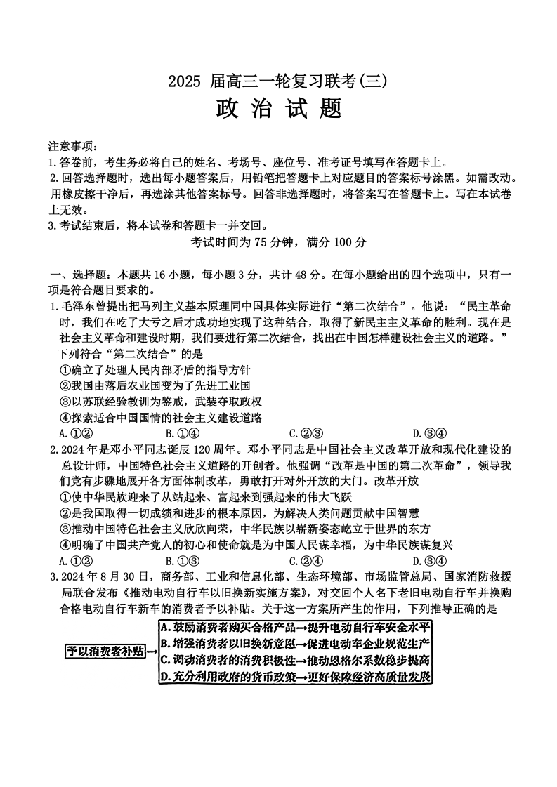 福建省部分学校2025 届高三一轮复习期中联考(三)政治