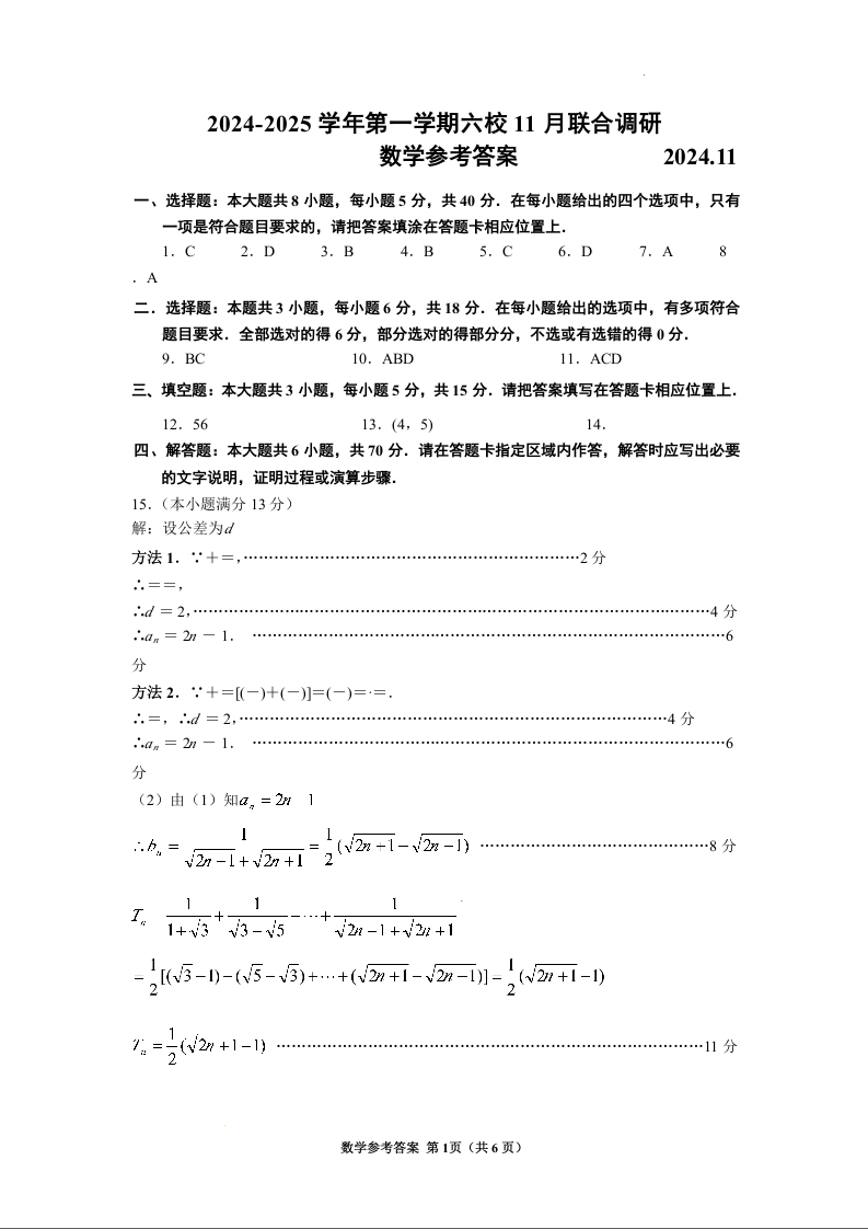 江苏省南京市2024-2025学年第一学期六校11月高三联合调研数学答案
