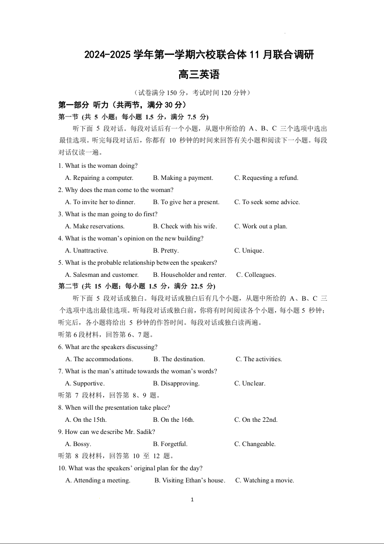 江苏省南京市2024-2025学年第一学期六校11月高三联合调研英语