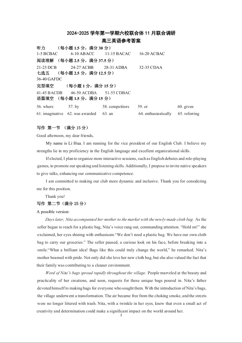 江苏省南京市2024-2025学年第一学期六校11月高三联合调研英语答案