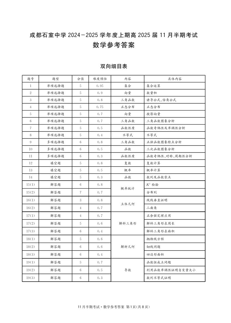 四川省成都市石室中学2024-2025学年高三上学期期中考试数学答案
