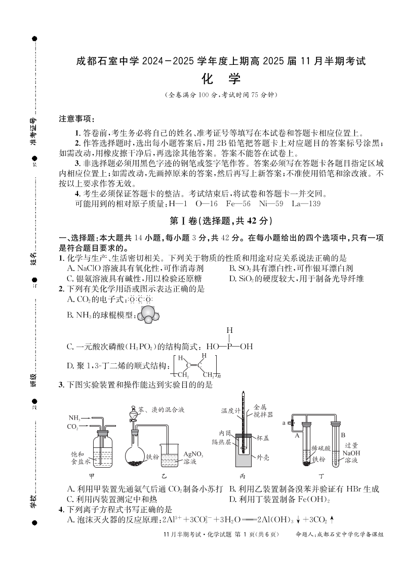 四川省成都市石室中学2024-2025学年高三上学期期中考试化学