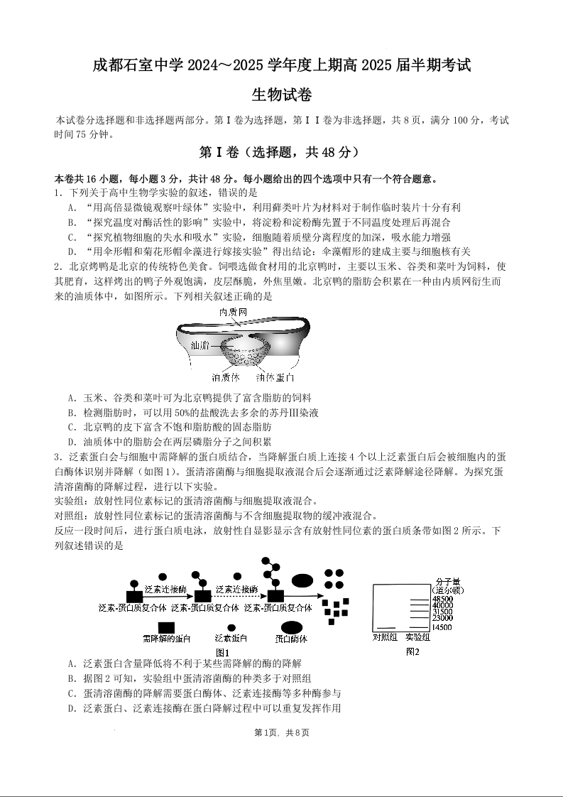 四川省成都市石室中学2024-2025学年高三上学期期中考试生物