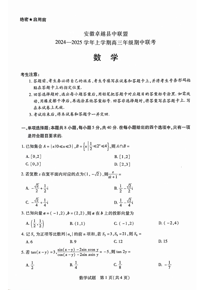 安徽省卓越县中联盟2025届高三11月期中考试数学