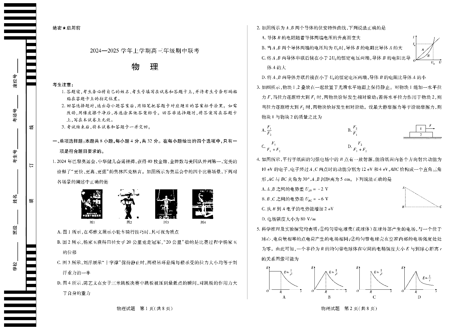 安徽省卓越县中联盟2025届高三11月期中考试物理+答案