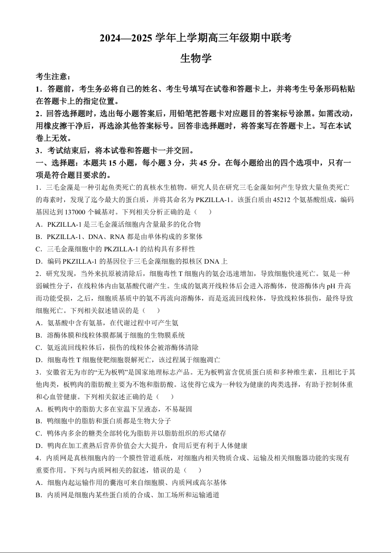 安徽省卓越县中联盟2025届高三11月期中考试生物+答案