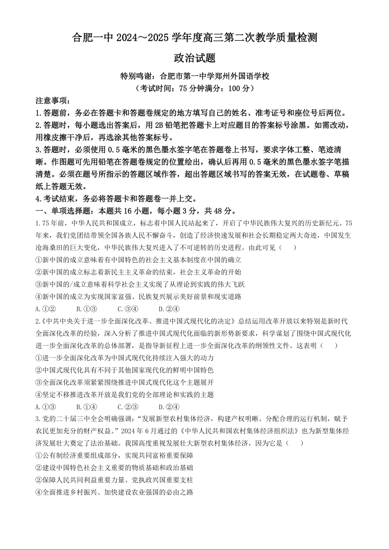 安徽省十联考合肥市一中2025届高三上学期第二次教学检测政治
