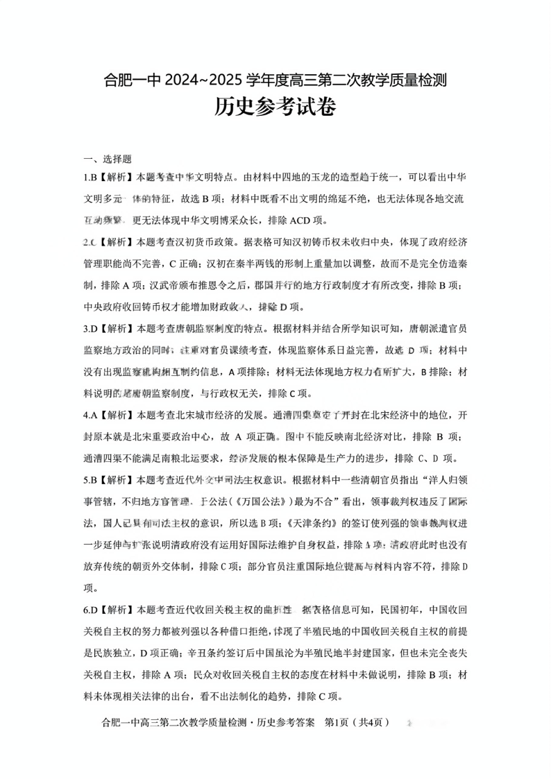 安徽省十联考合肥市第一中学2025届高三上学期第二次教学检测历史答案