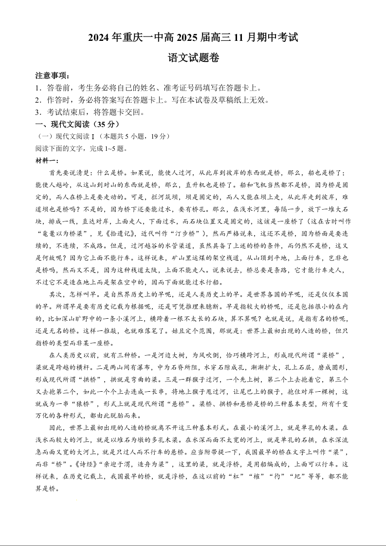 重庆市第一中学2025届高三11月期中考试语文+答案