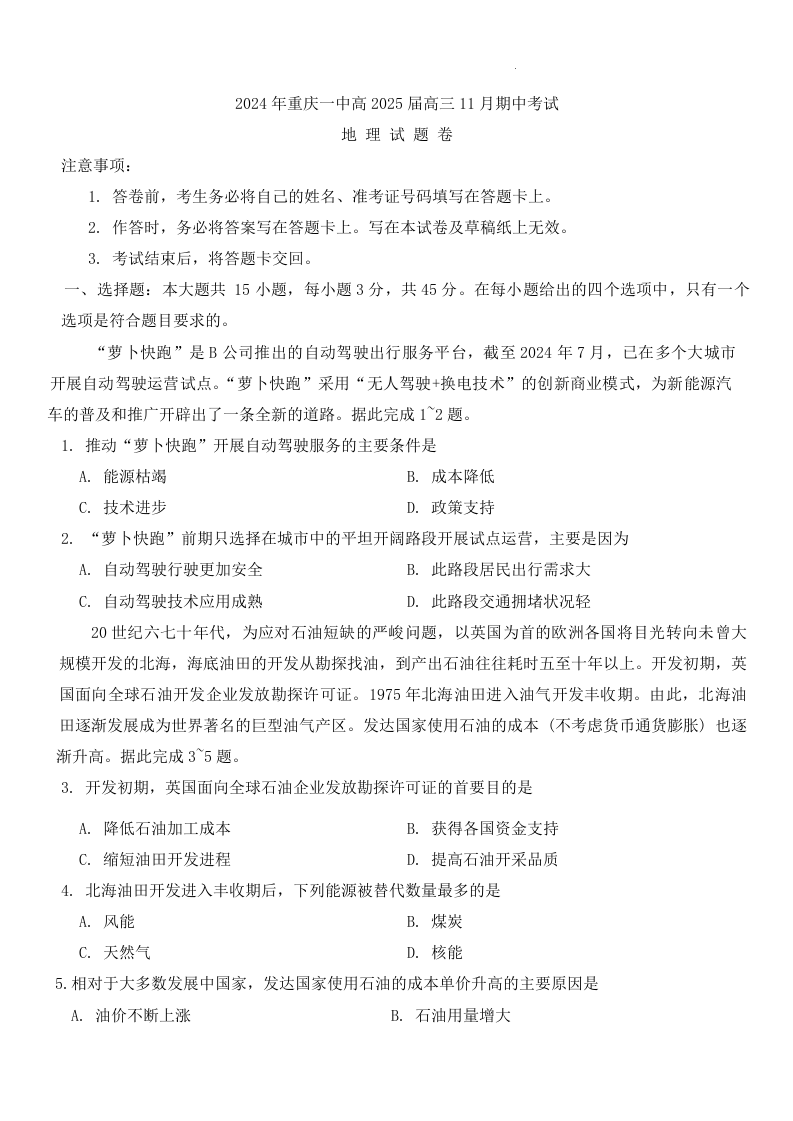 重庆市第一中学2025届高三11月期中考试地理