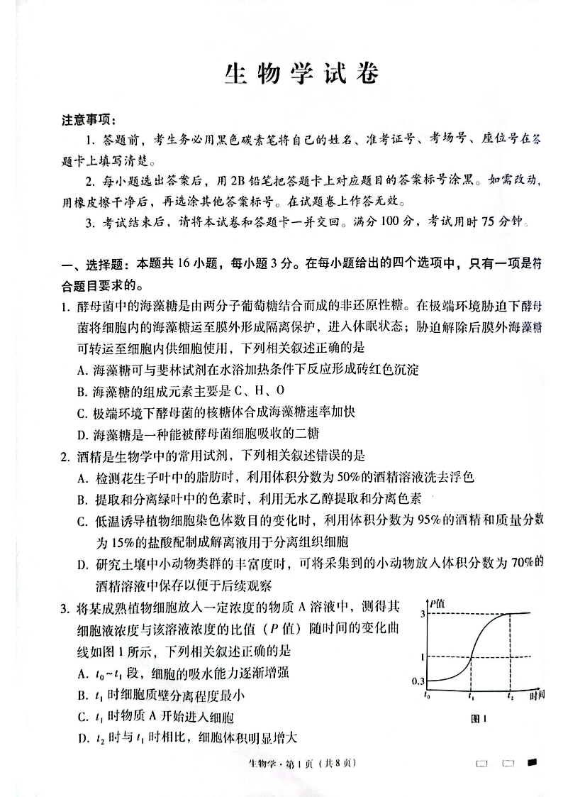 云南师范大学附属中学2025届高三高考适应性月考卷(六)生物