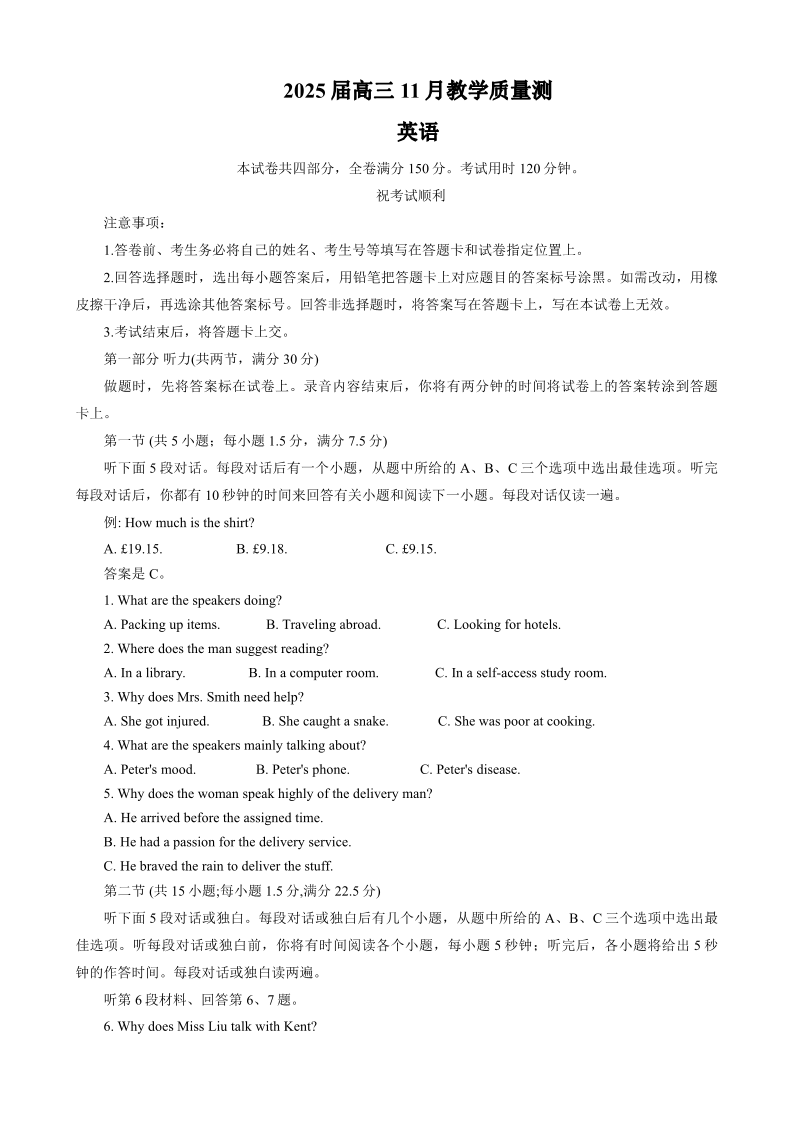 湖北省华大新高考联盟2025届高三11月教学质量测评英语