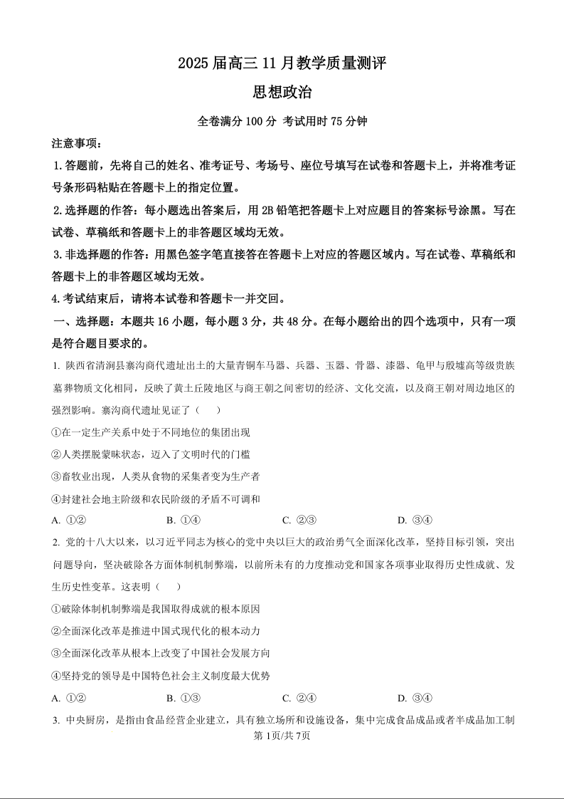 湖北省华大新高考联盟2025届高三11月教学质量测评政治(原卷版)