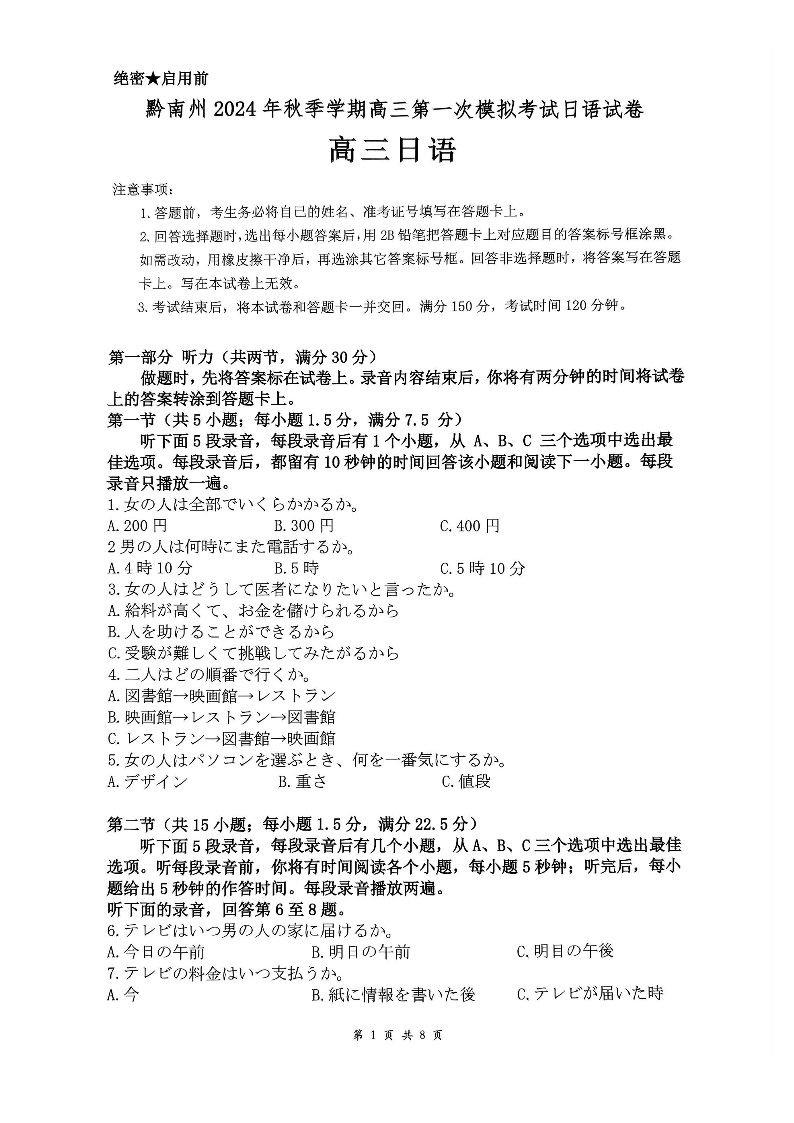 贵州省黔南州2025届高三年级第一次模拟考试日语