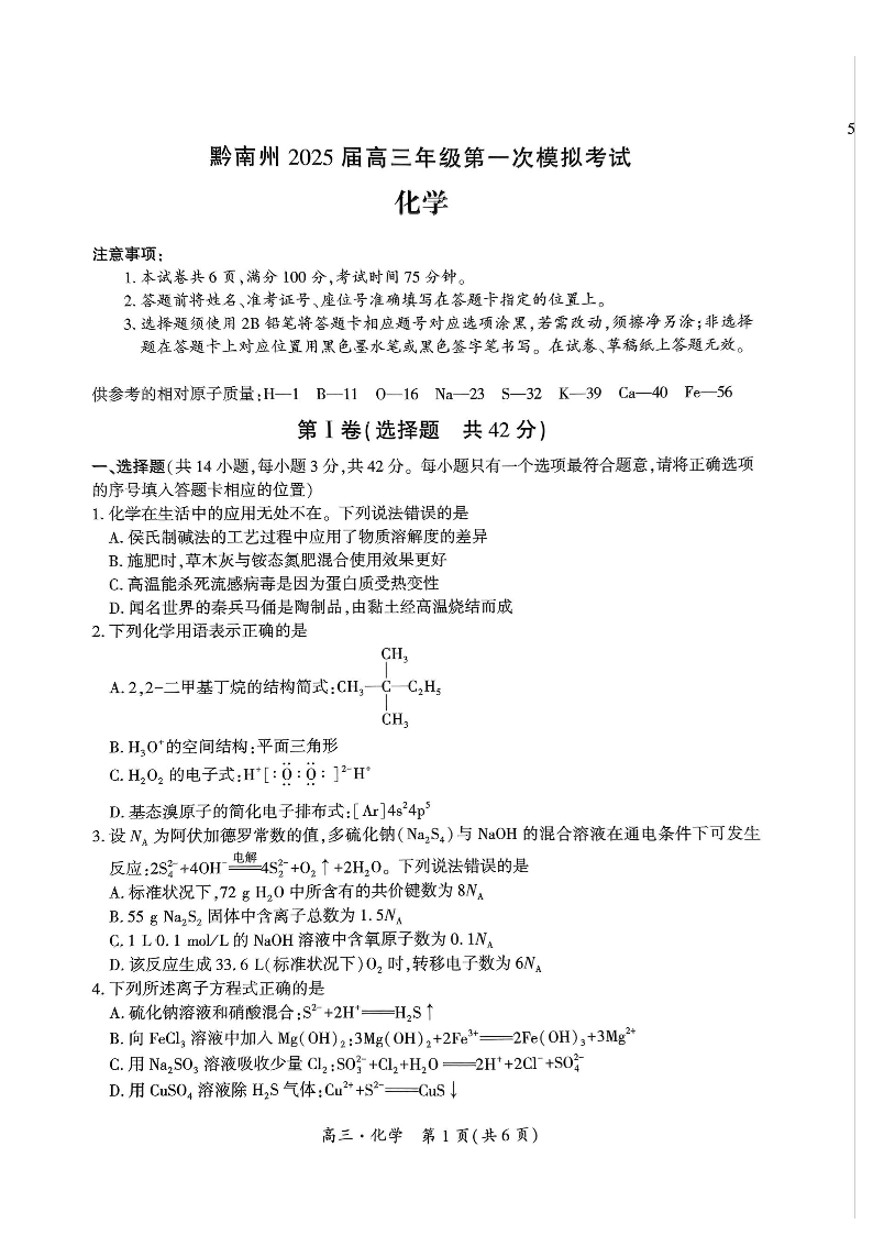 贵州省黔南州2025届高三年级第一次模拟考试化学