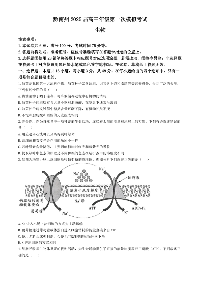 贵州省黔南州2025届高三年级第一次模拟考试生物