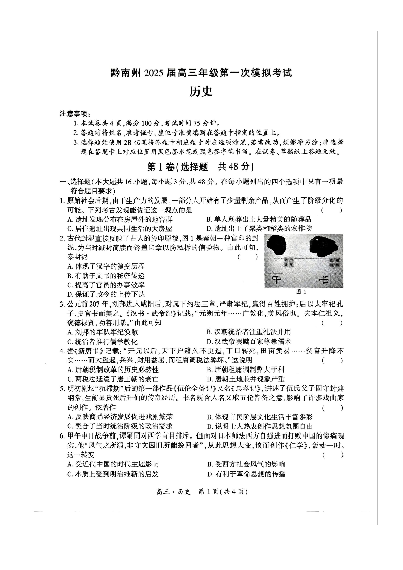 贵州省黔南州2025届高三年级第一次模拟考试历史