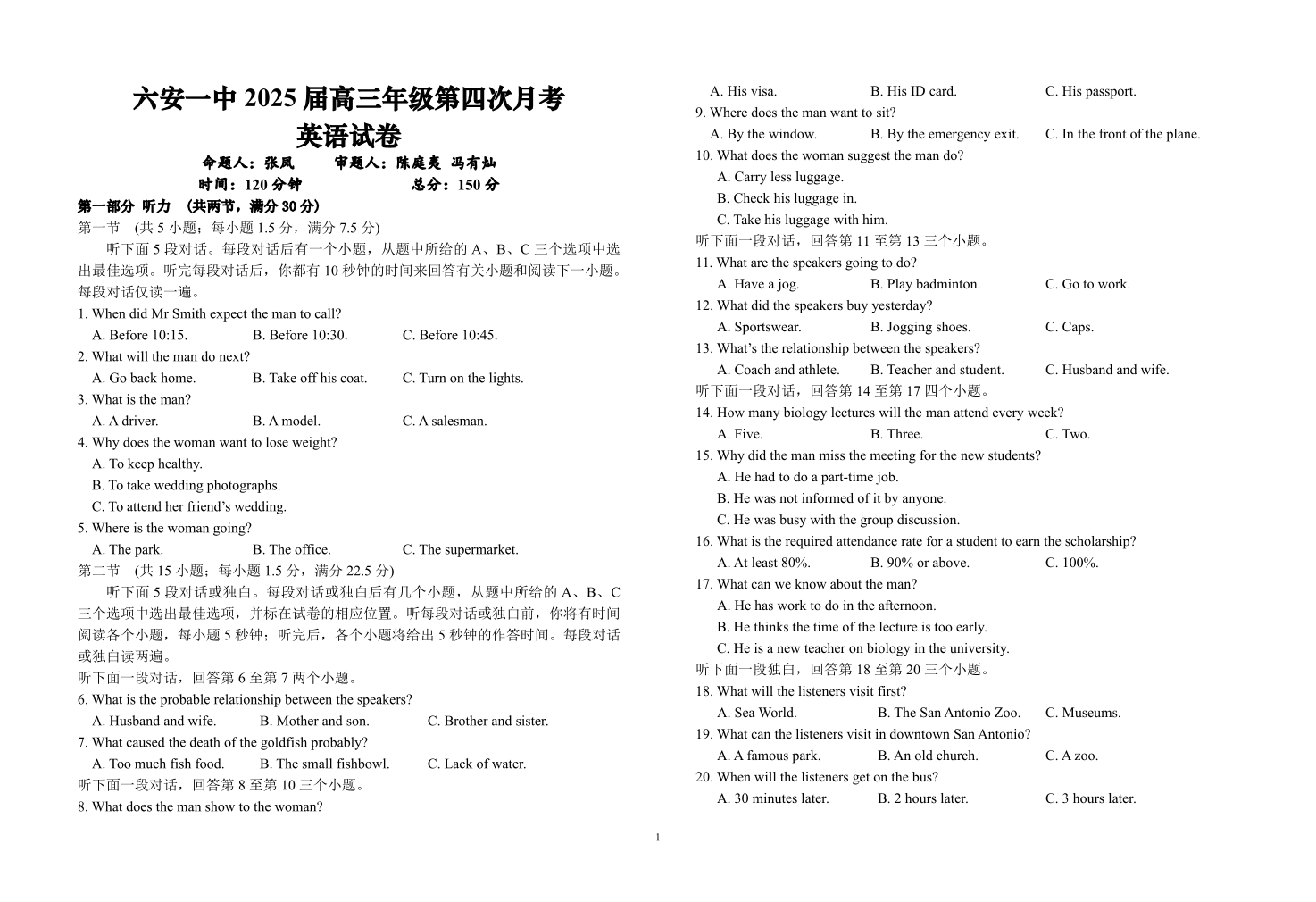 安徽省六安第一中学2025届高三上学期第四次月考英语+答案