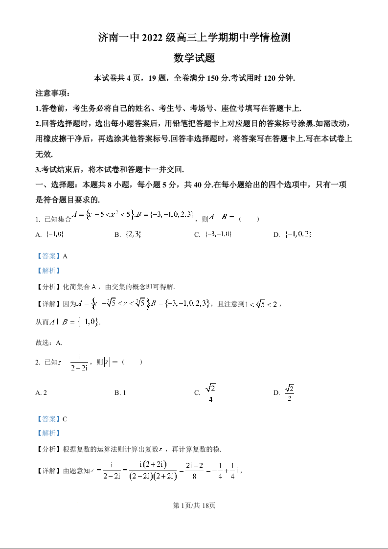山东省济南一中2022级高三上学期期中学情检测数学(精品解析版)