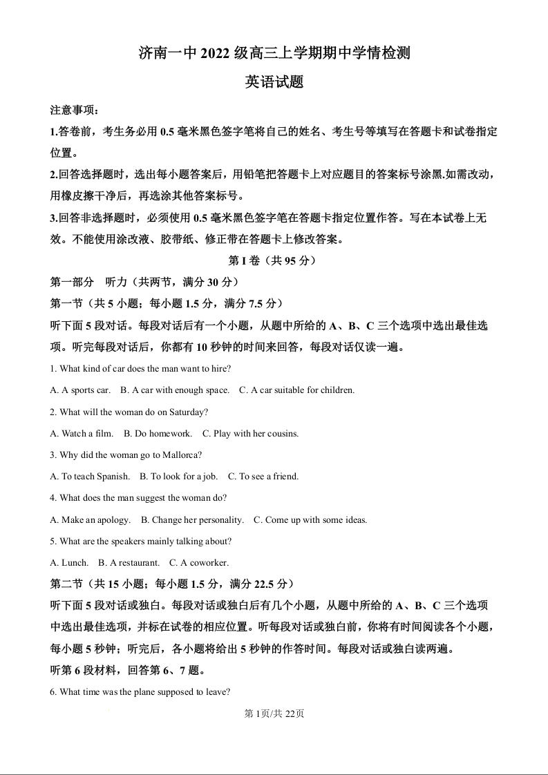 山东省济南一中2022级高三上学期期中学情检测英语(精品解析版)