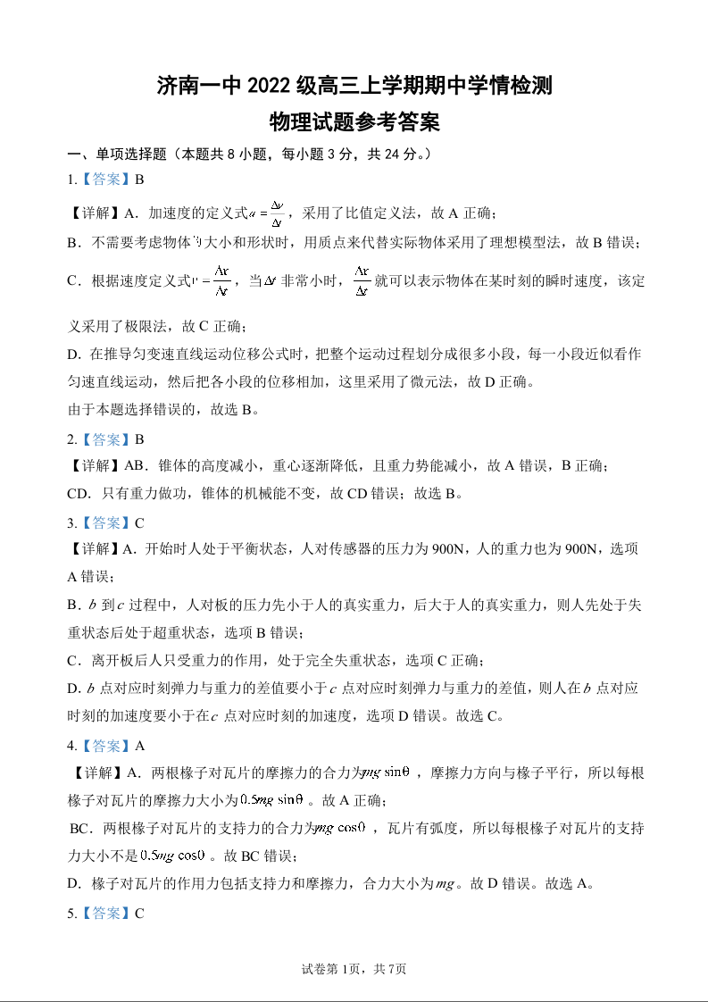 山东省济南一中2022级高三上学期期中学情检测物理答案