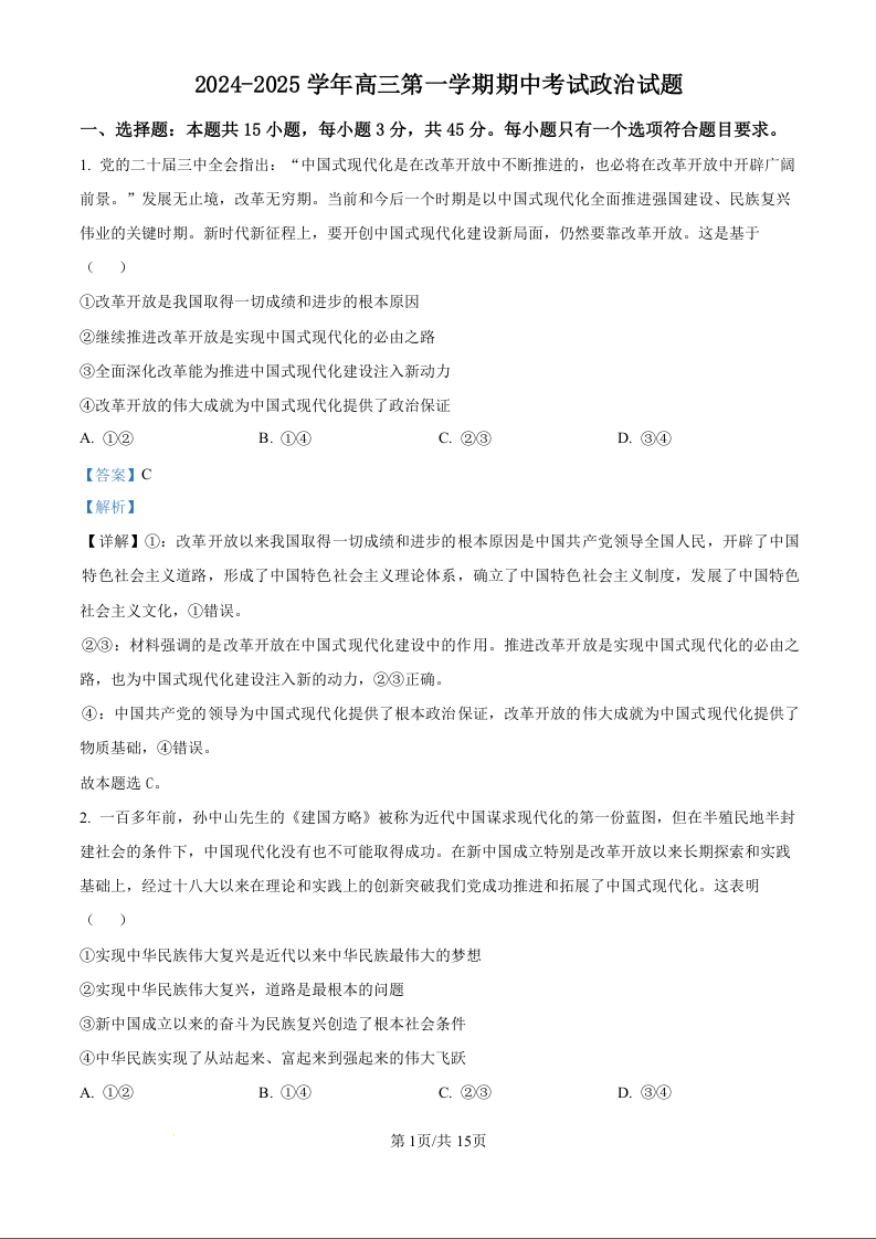 山东省济南一中2022级高三上学期期中学情检测政治(精品解析版)