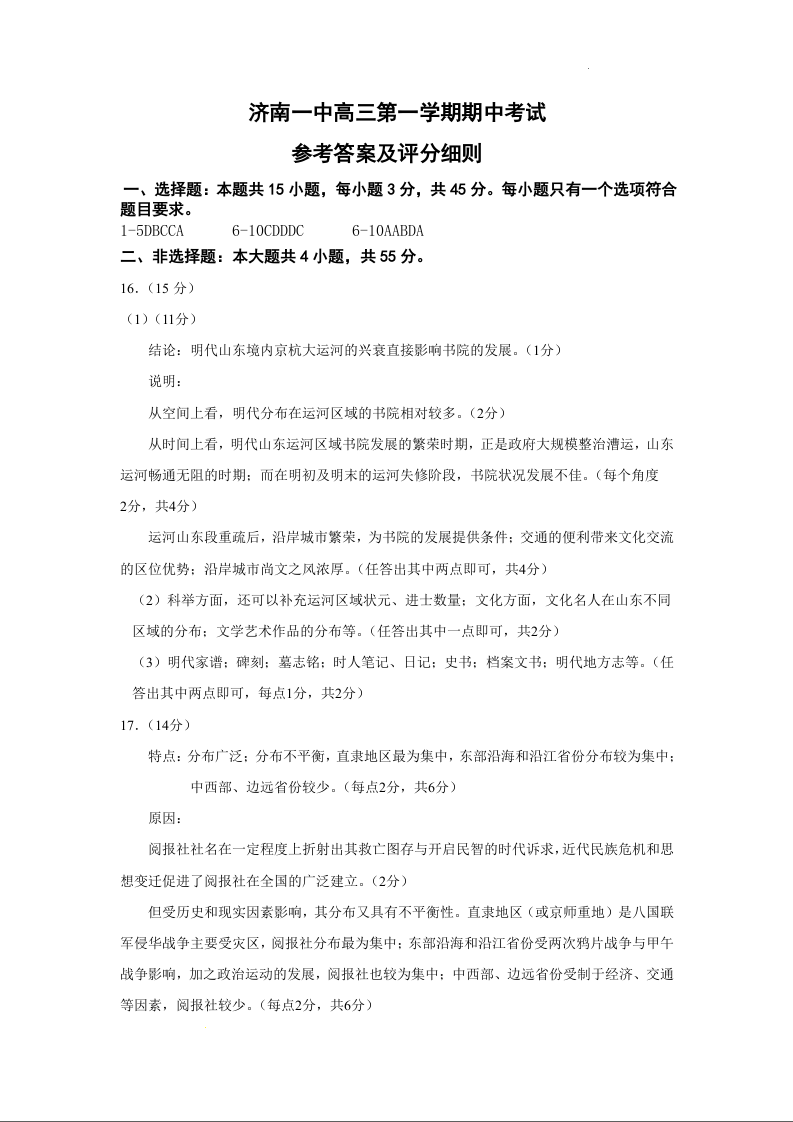 山东省济南一中2022级高三上学期期中学情检测历史答案