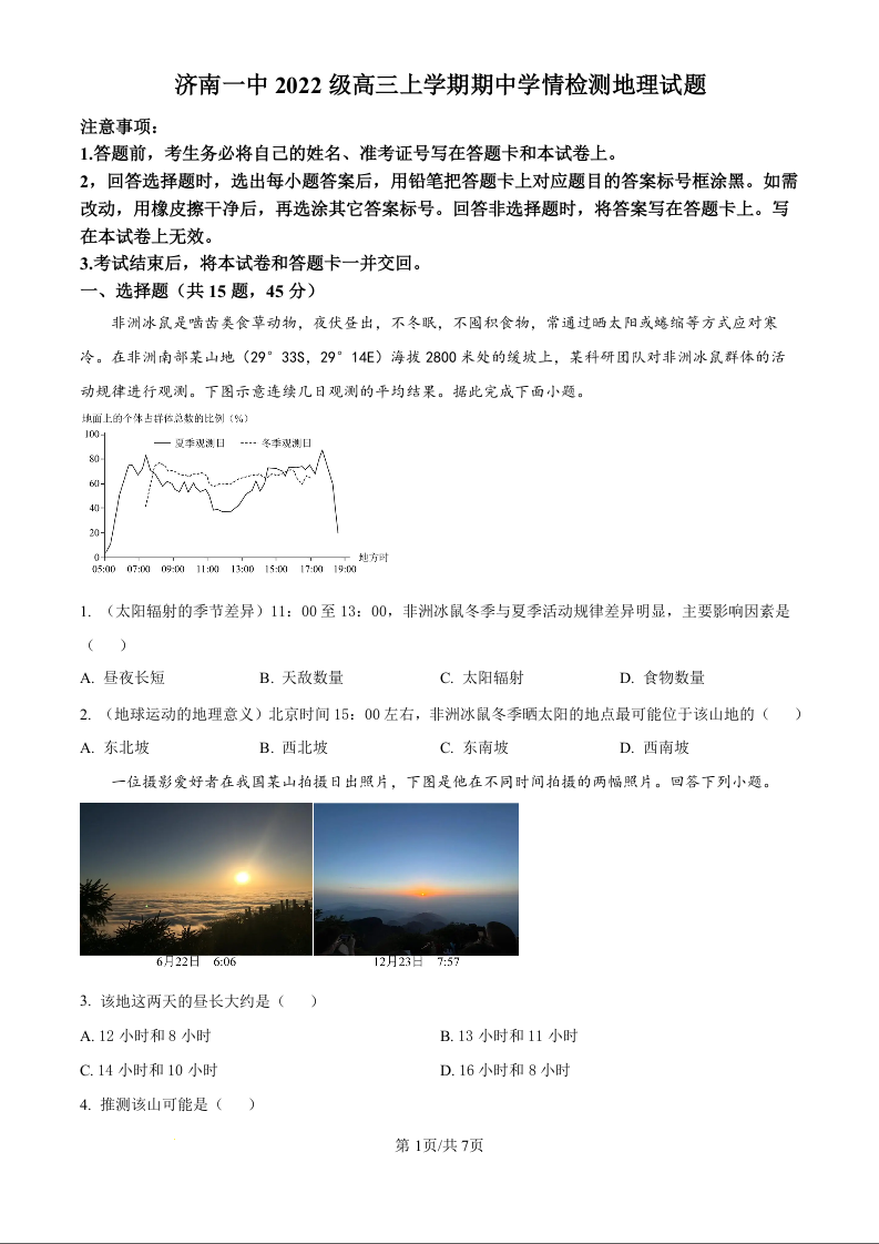 山东省济南一中2022级高三上学期期中学情检测地理(原卷版)