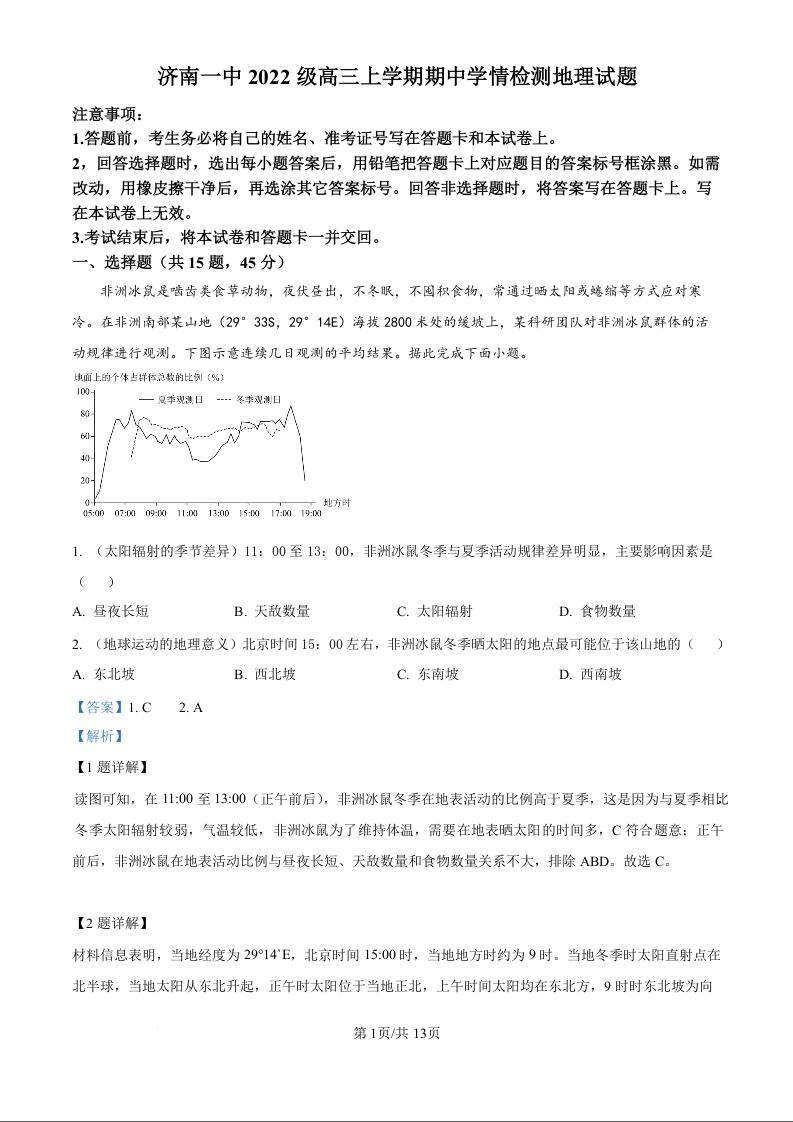 山东省济南一中2022级高三上学期期中学情检测地理(精品解析版)