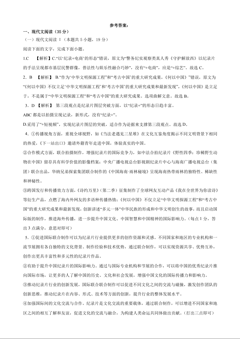 辽宁省鞍山市重点高中协作校2025届高三上学期期中考试语文答案