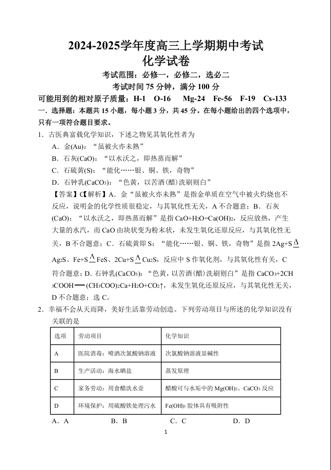 辽宁省鞍山市重点高中协作校2025届高三上学期期中考试化学答案