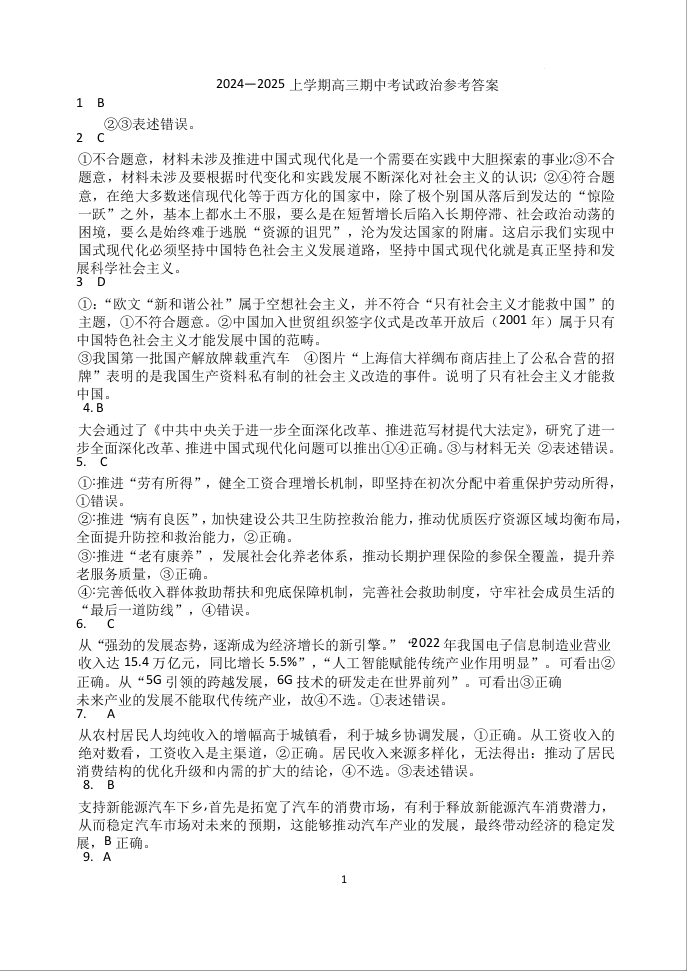 辽宁省鞍山市重点高中协作校2025届高三上学期期中考试政治答案