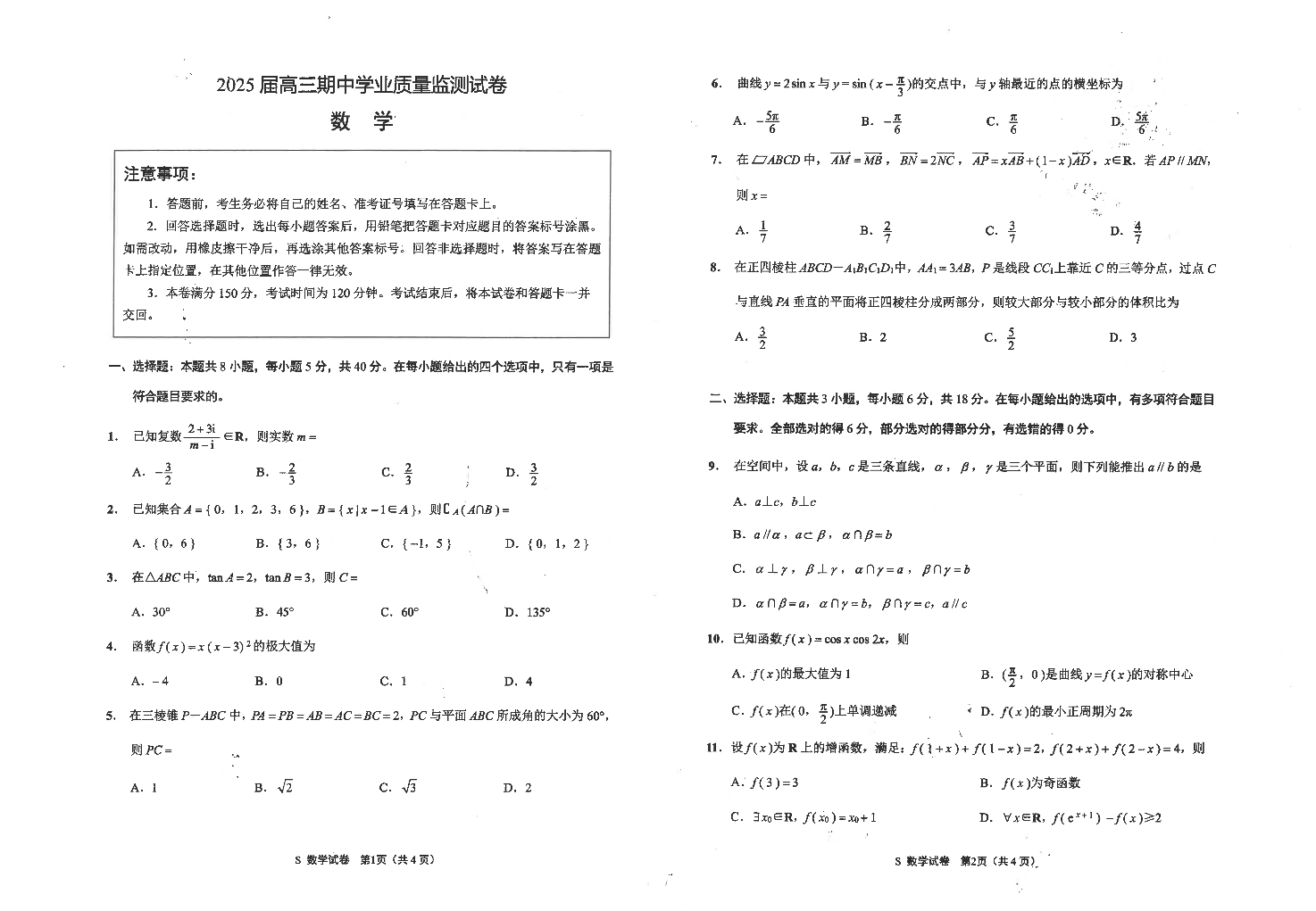 江苏省海安高级中学2025届高三上学期期中考试数学+答案