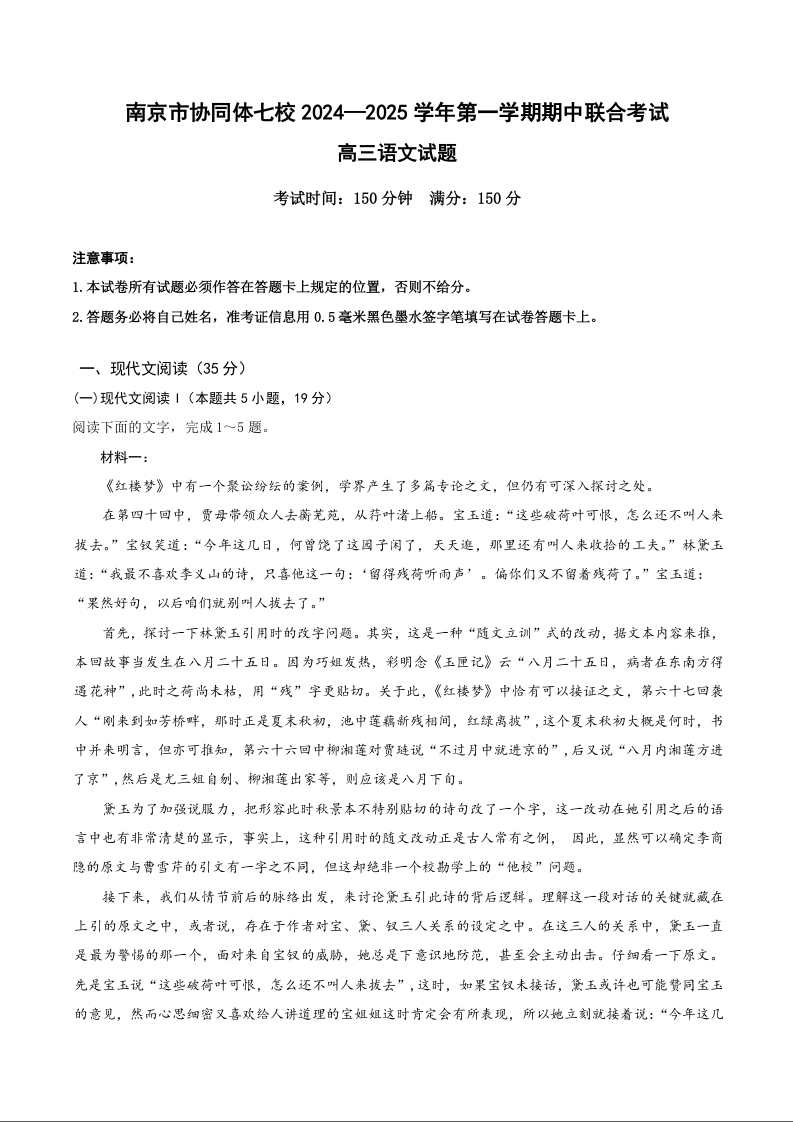 江苏省南京市协同体七校2025届高三期中联合考试语文
