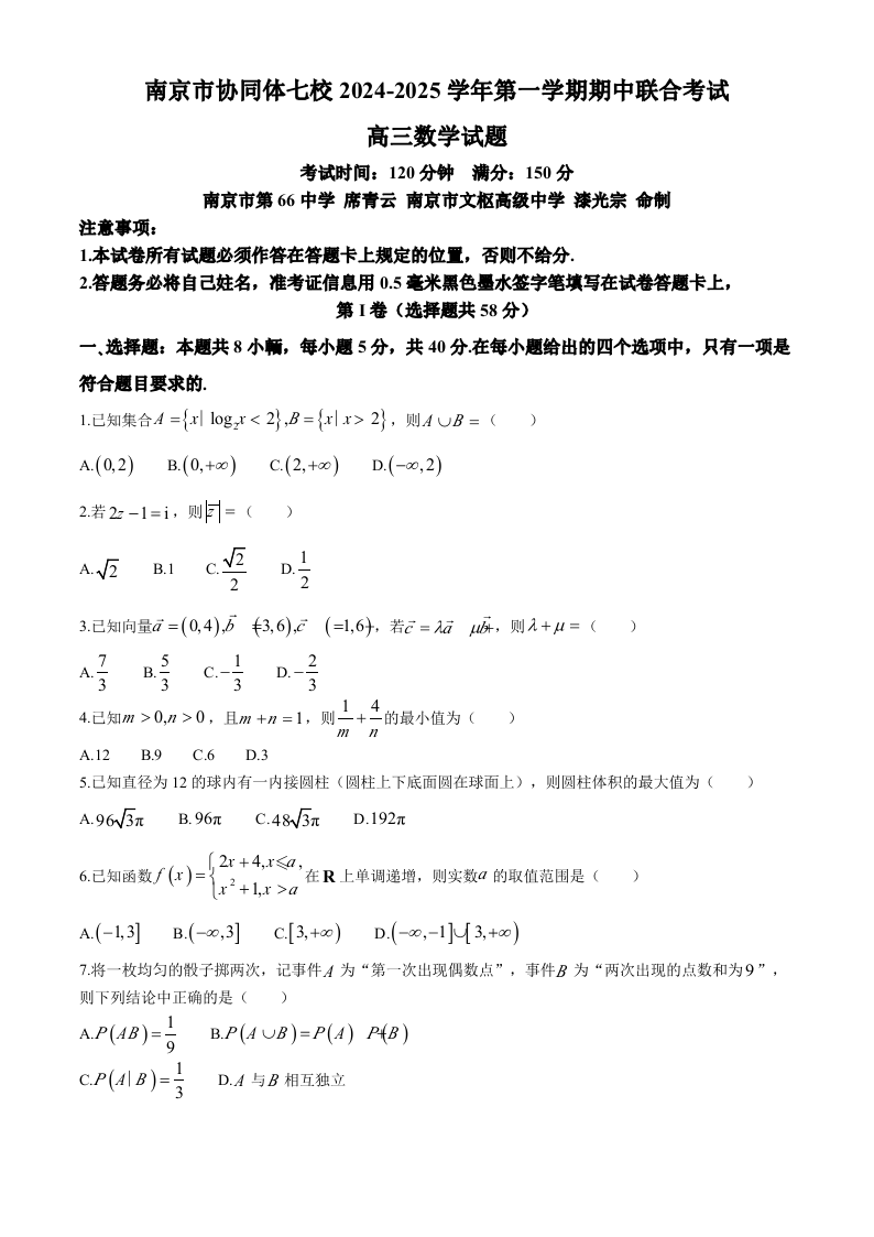 江苏省南京市协同体七校2025届高三期中联合考试数学+答案