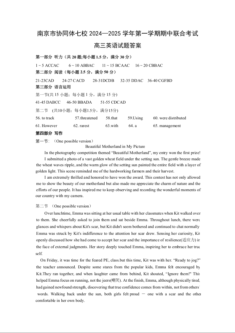 江苏省南京市协同体七校2025届高三期中联合考试英语答案