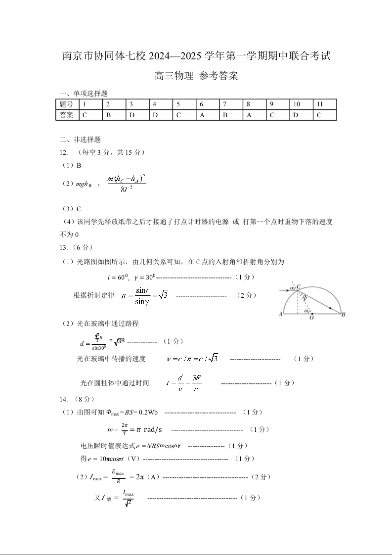 江苏省南京市协同体七校2025届高三期中联合考试物理答案