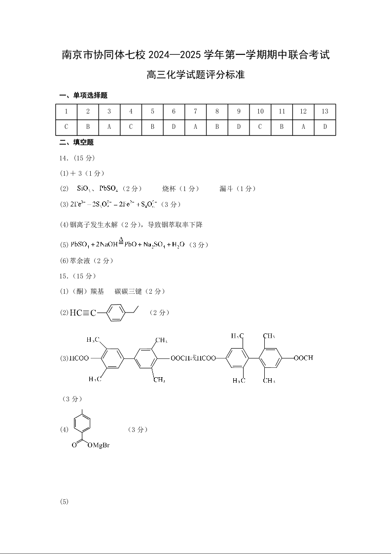 江苏省南京市协同体七校2025届高三期中联合考试化学答案