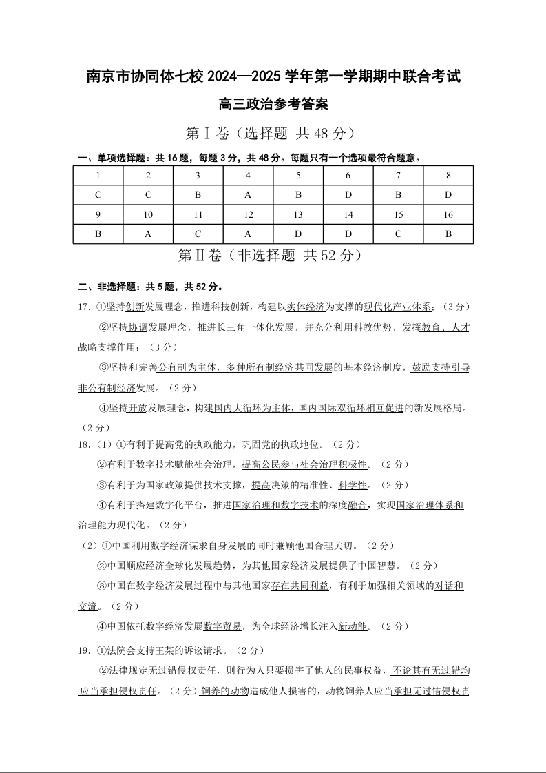 江苏省南京市协同体七校2025届高三期中联合考试政治答案