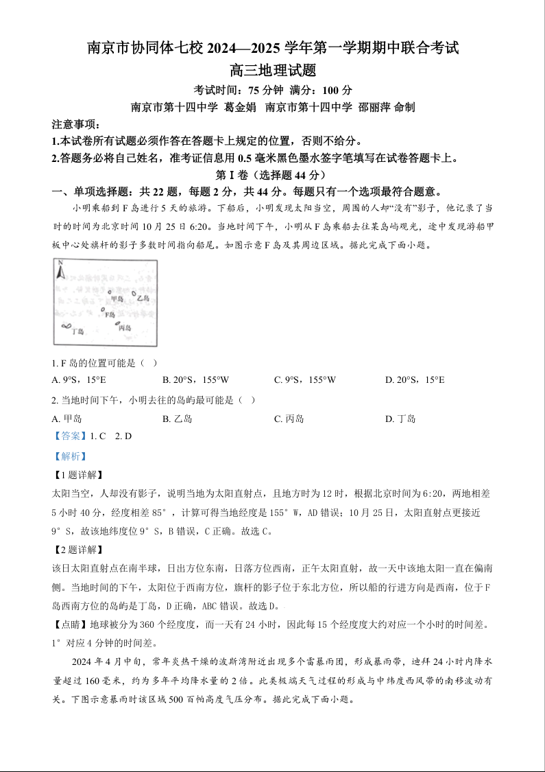 江苏省南京市协同体七校2025届高三期中联合考试地理(精品解析版)