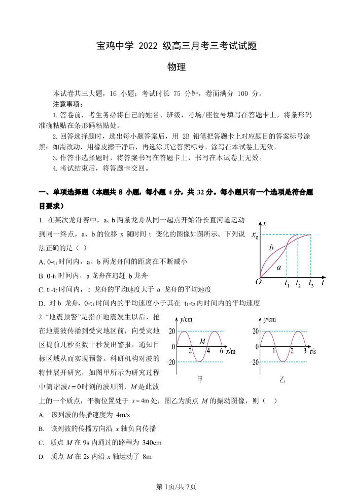 陕西省宝鸡中学2025届高三上学期12月月考物理