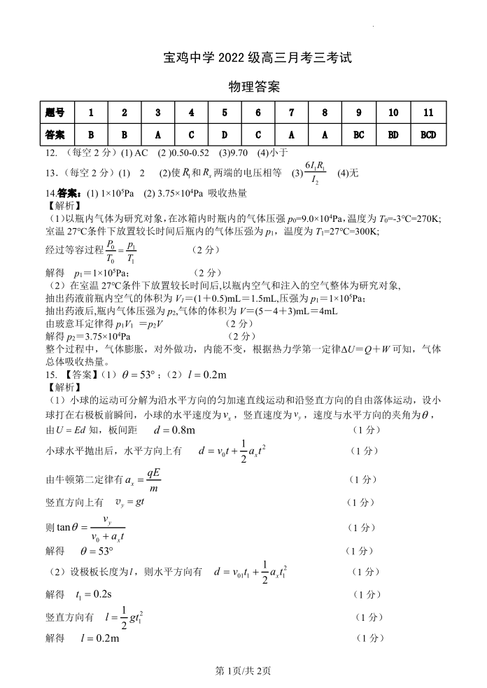 陕西省宝鸡中学2025届高三上学期12月月考物理答案