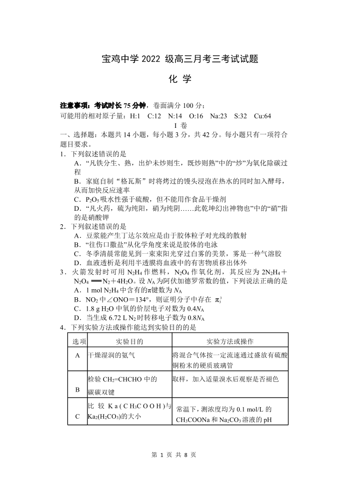 陕西省宝鸡中学2025届高三上学期12月月考化学