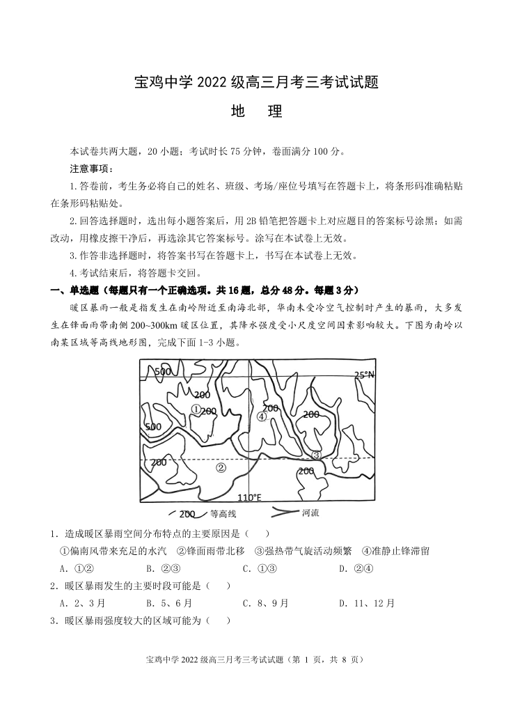 陕西省宝鸡中学2025届高三上学期12月月考地理